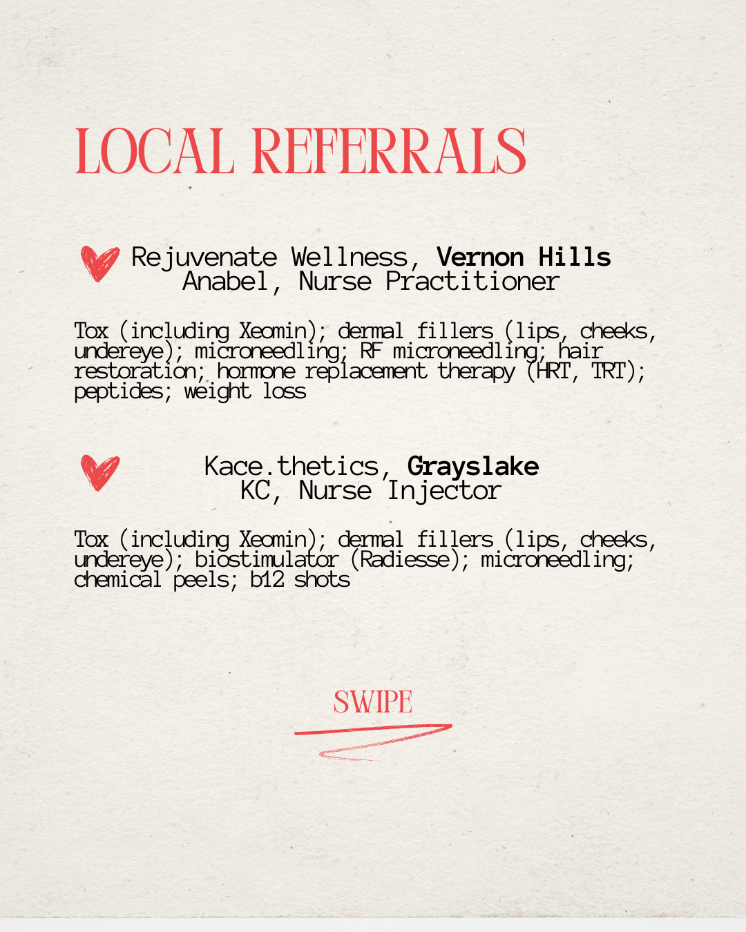 Tox (Wrinkle Relaxer), chemical peels, microneedling, laser